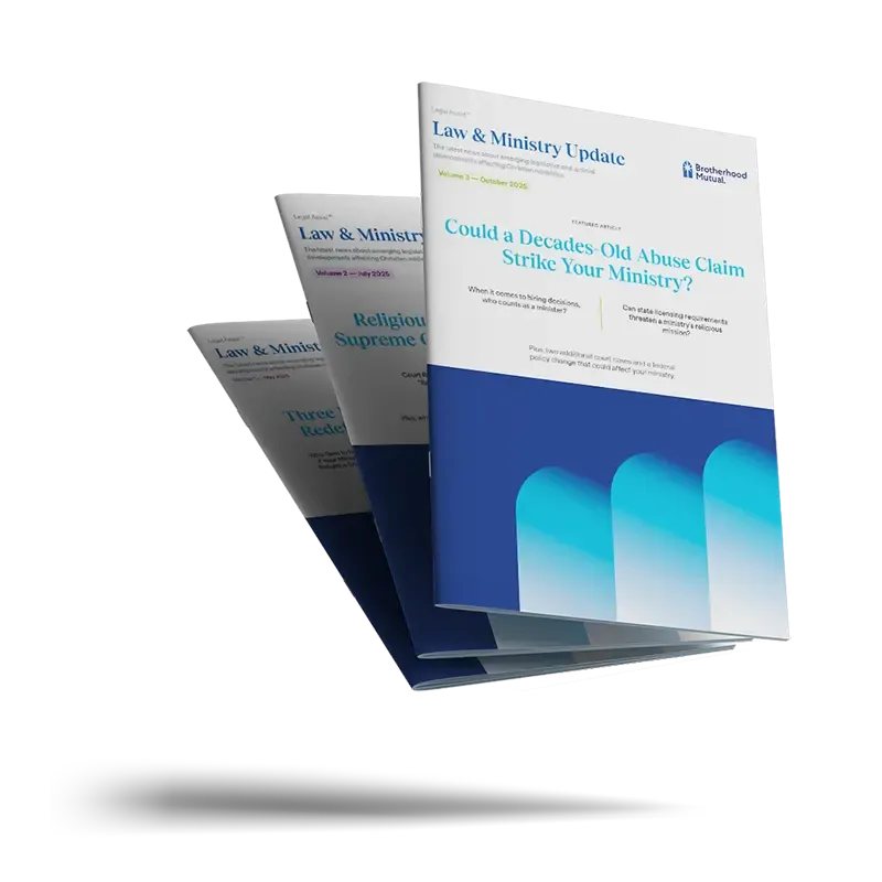 Brotherhood Mutual’s newest resource is here to help ministries understand rapidly developing challenges that could affect their organizations. The team from Legal AssistSM is monitoring cases to provide ministries with timely updates and actionable insights from an insurance and risk management perspective. From Supreme Court rulings to emerging state laws, the goal is to inform and empower ministries to adapt and thrive in an increasingly complex legal environment.